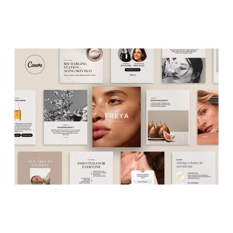 تم إنشاء مجموعة Freya Social Media Kit من Studio Dara في Canva وتتميز بجمالية بسيطة ومثالية لماركات العناية بالبشرة والجمال والمؤثرين واستوديوهات التصميم. تتضمن الحزمة 42 نموذجا فريدا بدقة 1500 × 1500 بكسل. يتصفح معظم المستخدمين خلاصات Instagram الخاصة بهم على هواتفهم - وحجم الصورة الشخصية في Instagram أساسي للجوال. تم تحسين المنشورات الشخصية لخوارزمية Instagram ويمكن أن تكون ملفتة للنظر للغاية في موجز مليء بالصور المربعة. لقد أنشأنا أنماط منشورات بورتريه مختلفة بحيث يمكنك مشاركة المنتجات والخدمات والأخبار والعروض الترويجية والاتجاهات والاقتباسات والصور النابضة بالحياة ورسائل الحث على اتخاذ إجراء والمزيد لجذب الجمهور المستهدف المناسب. وفر وقتك وأموالك وأنتج عملا عالي الجودة.