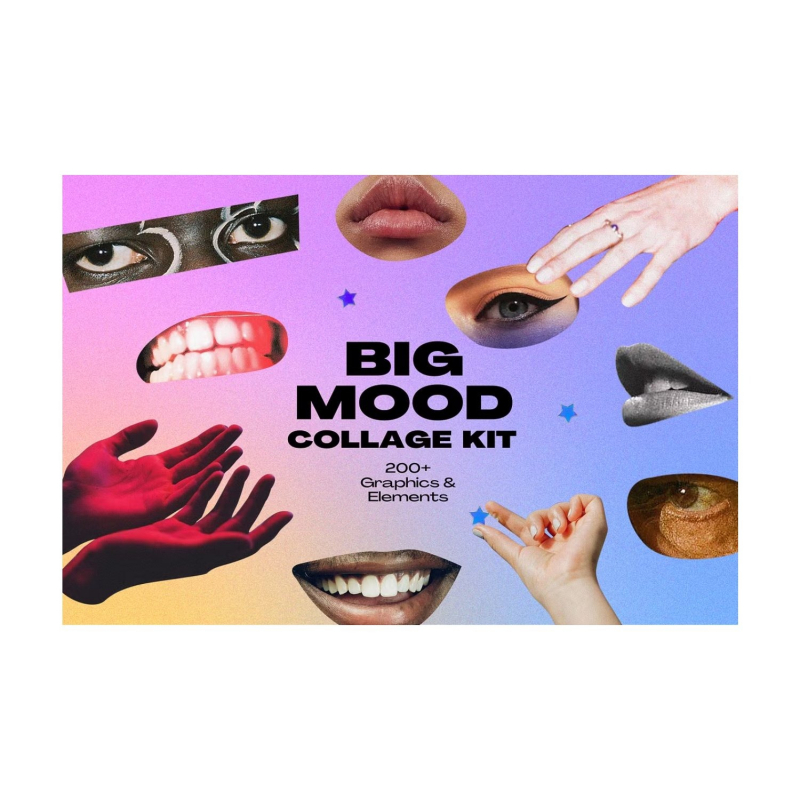 Big Mood collage kit features more than 200 cut-outs of Hands, Eyes, and Mouth. These can be used to add bold extra flavor to a variety of designs, art, and merchandise. Also includes custom hand-made collage elements like paint brush strokes and colorful paper scraps.