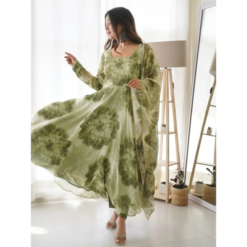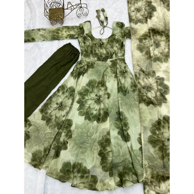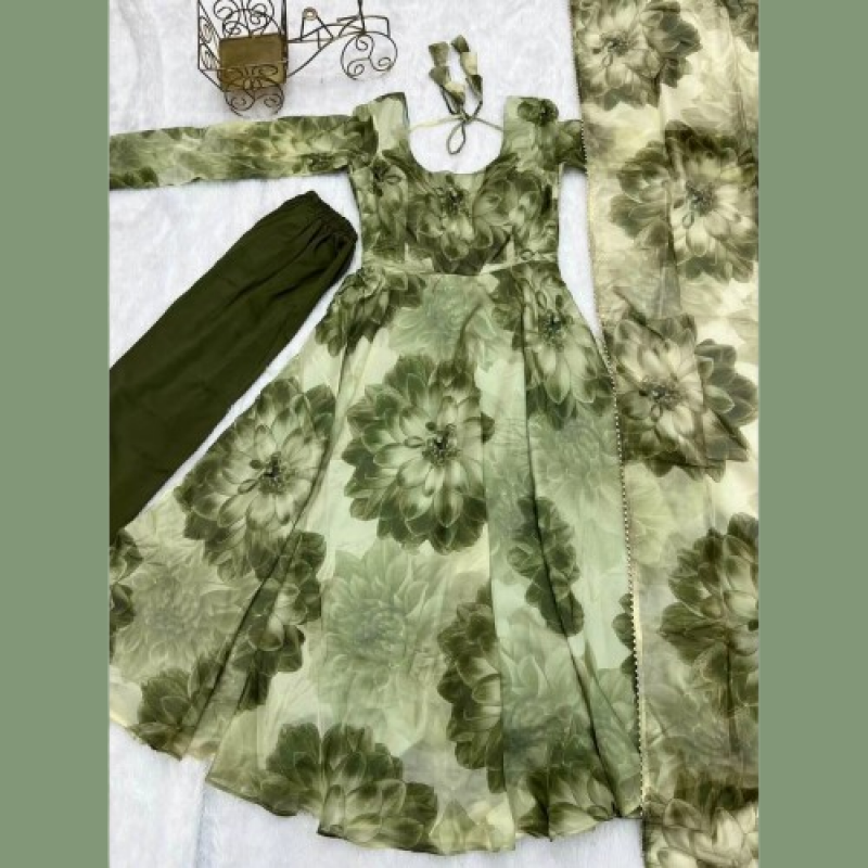 FASHIONABAL TABBY ORGANZA SILK Service in 3D PRINT GOWN PANT WITH DUPATTA GREEN