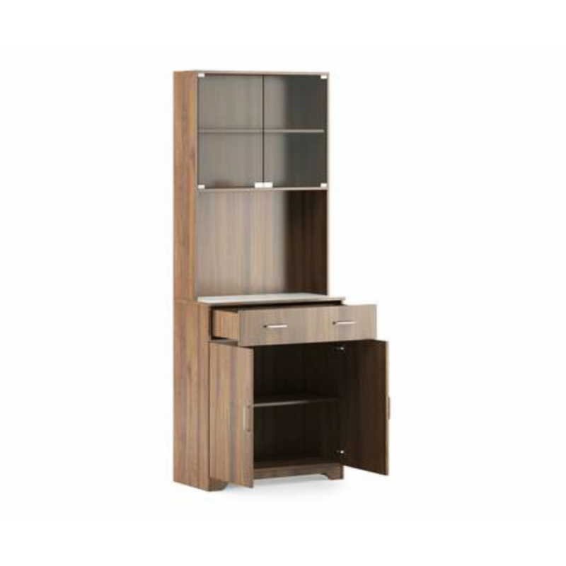 A ton of storage. The Hubert kitchen cabinet is the storage superstar your kitchen has been looking for. A mix of open and closed storage makes room for cutlery, vessels, and all else. The glass-fronted shelves provide the perfect niche for your prize china, while the melamine table top doubles up as counter space for appliances. Just what you need, whether you’re a budding cook or a practised chef!