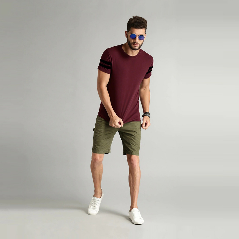 Maroon solid T-shirt, has a round neck, short sleeves.