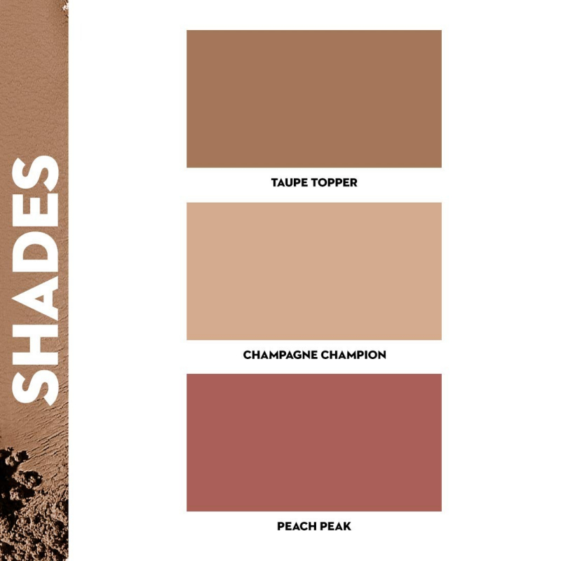 (L to R): Taupe Topper (Cool-toned Brown Bronzer), Champagne Champion (Champagne Gold Highlighter), and Peach Peak (Soft Peach Pink Blush)