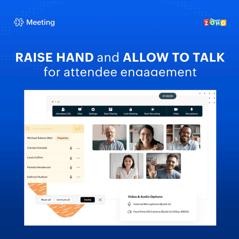 • Host and attend online meetings, collaborate with up to 10 participants in meetings through audio, video, and screen sharing features